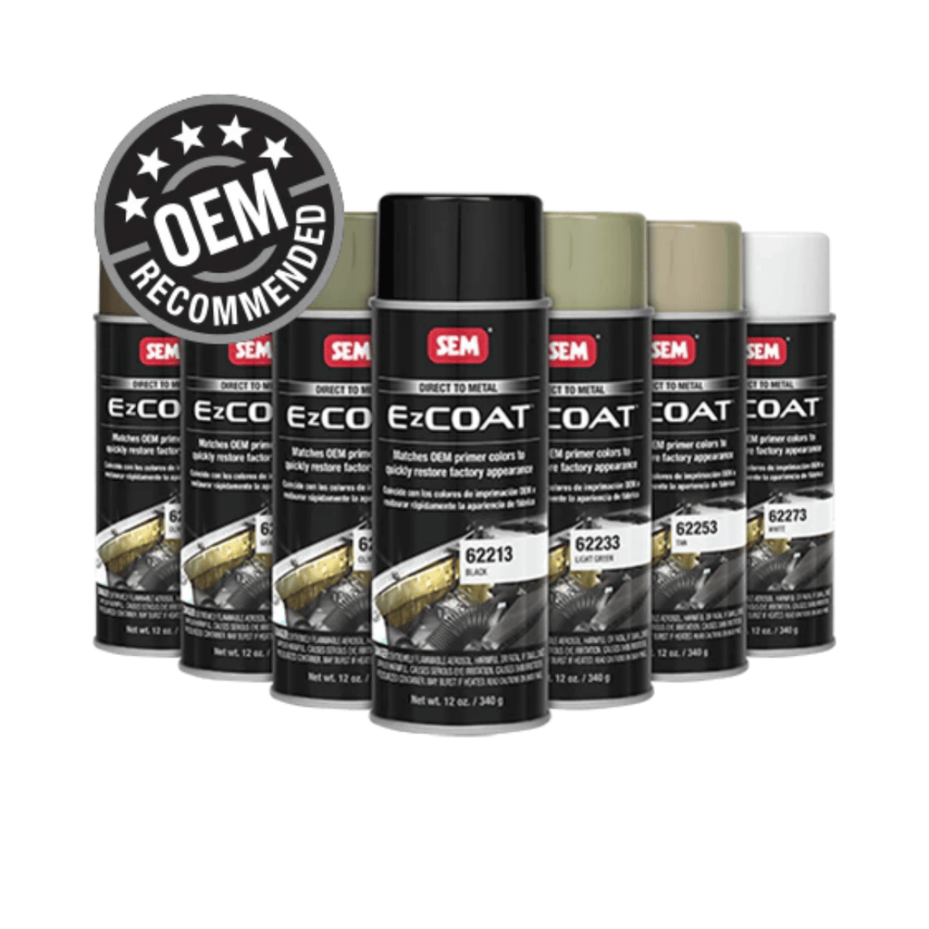 SEM EZ Coat's are a corrosion resistant, color matched coating that restores the original appearance and gloss of factory E-Coat. Use on any e-coated panel, vehicle floor, engine bay, cross members, core supports, door skins. Can be used as a DTM primer or as a single coating to match the OEM finish, is available in 9 colors and is compatible with most basecoats.